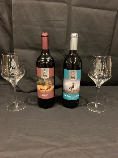 Cabernet Bottle and Merlot Bottle with 2 etched Engine 8 wine glasses.